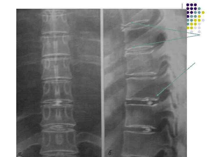 ОТВЕТ: l l 1. Сужение межпозвонковых пространств 2. Деформация передних краев тел позвонков