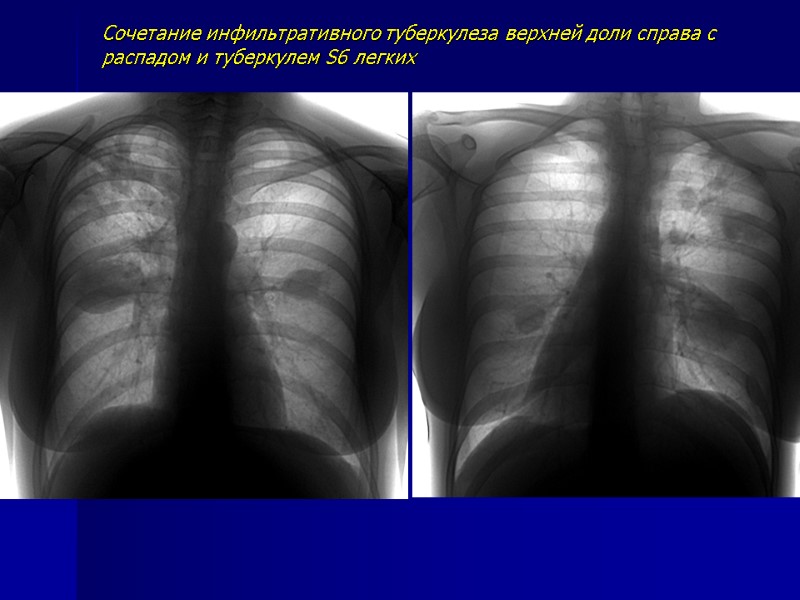 Сочетание инфильтративного туберкулеза верхней доли справа с распадом и туберкулем S6 легких