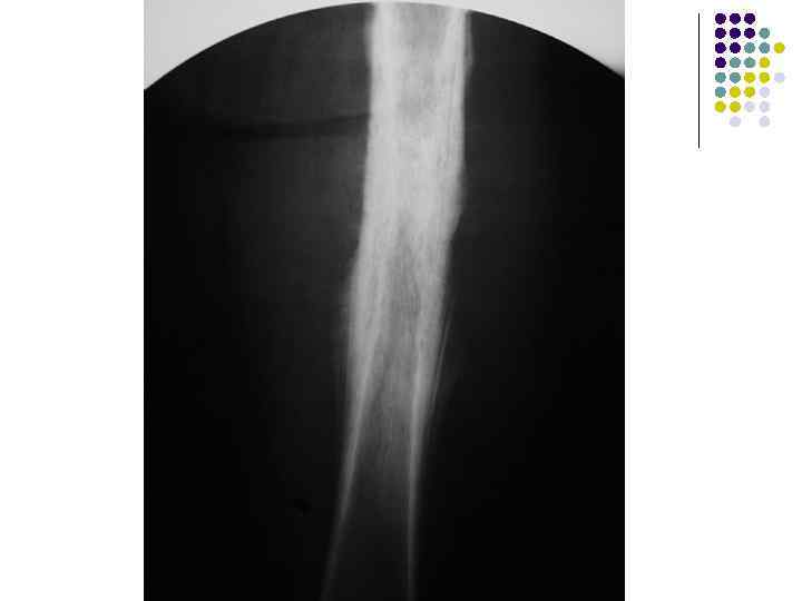 Рентгеновская семиотика l Неравномерный остеопороз l Проникающий тип деструкции с широкой транзиторной зоной в метафизе или диафизе длинной трубчатой кости, уплотнение и утолщение мягких тканей, имеющих происхождение из костной ткани l Склеротический тип (до 25%) - нечеткие наружные границы перестройки костной ткани, редка кортикальная деструкция при существенном объеме мягкотканного компонента (за счет распространения через гаверсовы каналы)