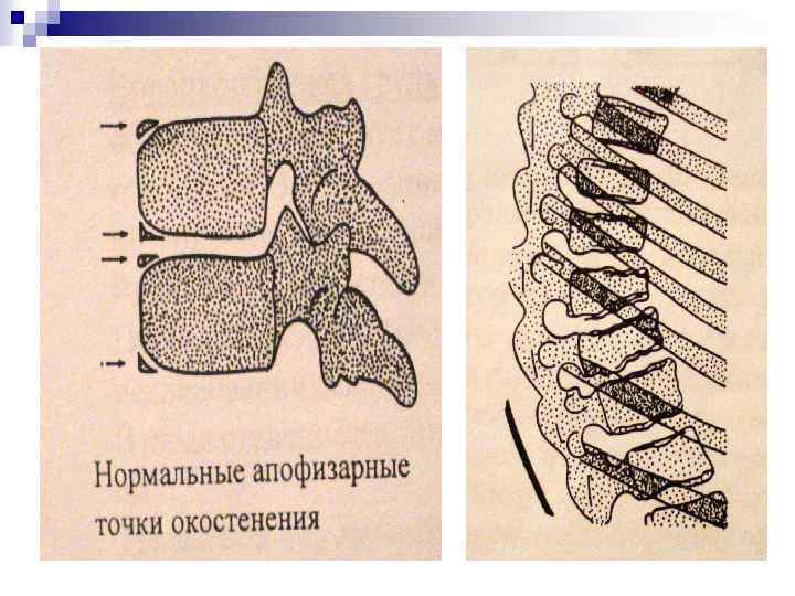 Стадии б-ни Шойермана-мау n n n I стадия – треугольные апофизарные тени приобретают пестрый вид, разрыхляются, контуры становятся неровными. Точно так же меняются контуры верхней и нижней площадок позвонков. Апофизарная светлая линия становится извилистой, расширяется, разбивается на дополнительные линии. II стадия – треугольные апофизарные тени как бы вдавливаются в переднюю часть позвонка. Тело позвонка приобретает переднюю клиновидную деформацию. структурный рисунок тел позвонков становится пестрым. Появляются полулунные, блюдцеобразные склеротические каемки вокруг вдавленных в губчатую структуру позвонков хрящевых узелков со стороны дисков (формирование грыж Шморля). Межпозвонковые диски на боковом снимке шире чем обычно. III стадия – наступает слияние апофизов с телами позвонков, структурный рисунок позвонков восстанавливается. Клиновидная деформация тел позвонков остается. Передние края позвонков заостряются, вытягиваются вперед, а передний край позвонка остается вогнутым.