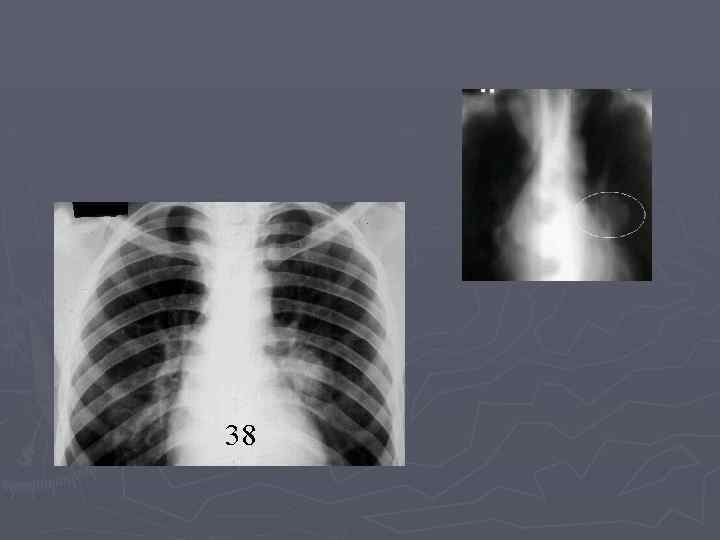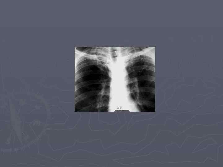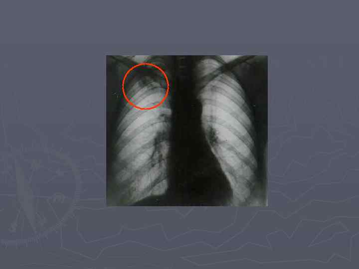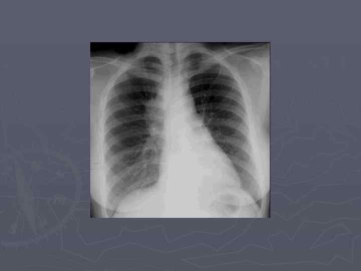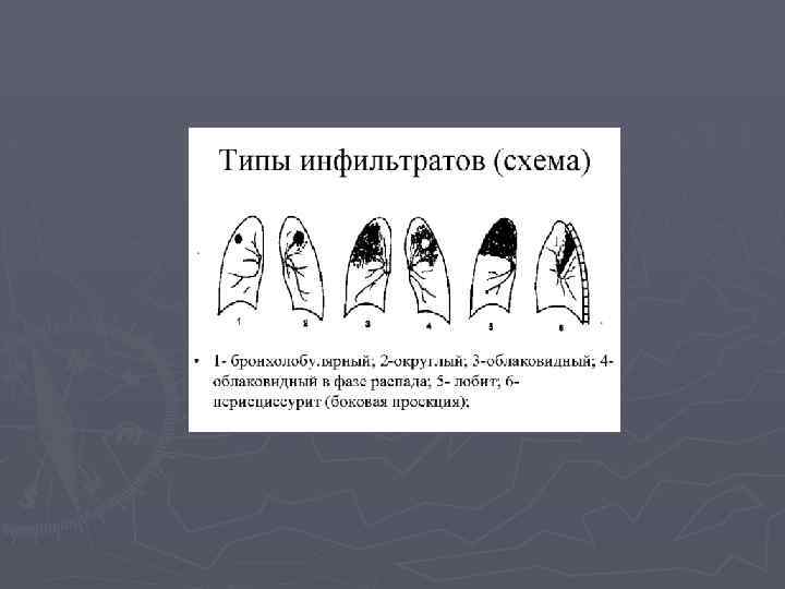 Рентгенологические синдромы при туберкулезе -Инфильтративное затемнение; -Шаровидное образование; -Полостное образование (кольцевидная тень); -Диссеминированный процесс в легких; -Скопление жидкости в плевральной полости; -Тотальное затемнение легочного поля; -Тенеобразование в средостении; -Пристеночное образование; -Ателектаз.
