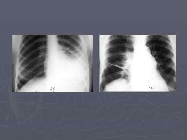 Фиброзно-кавернозный туберкулез легких. Рентгенологически определяются: картина фиброза и сморщивания легкого, старая фиброзная каверна (одна или несколько), плевральные наслоения. Картина фиброза и сморщивания легкого чаще всего обнаруживается в верхних долях, с преимущественным поражением одной из них. Средостение и трахея смещены в сторону большего поражения. Верхние доли уменьшены в объеме, прозрачность их резко понижена за счет гиповентиляции. Легочный рисунок резко деформирован вследствие развития грубого фиброза. В нижних отделах легких прозрачность часто повышена из-за их вздутия. Корни, как правило, смещены кверху.