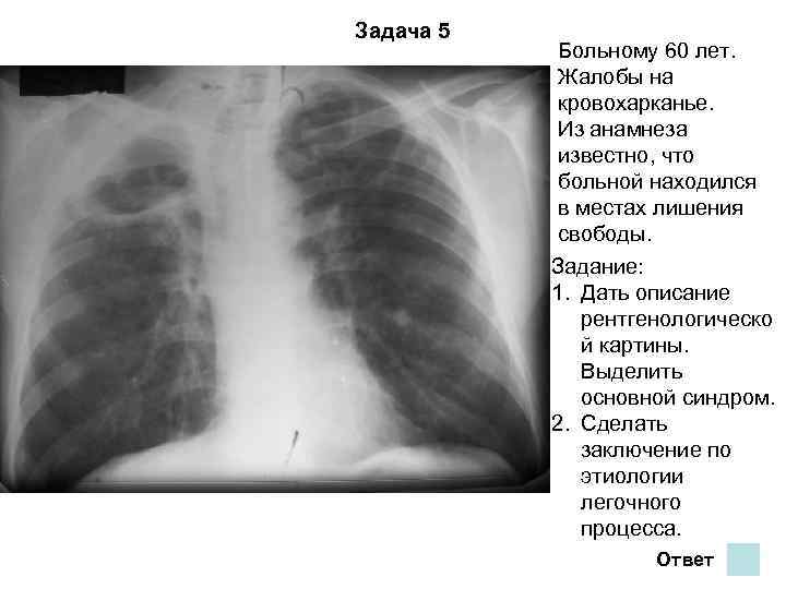 Задача 5 Больному 60 лет. Жалобы на кровохарканье. Из анамнеза известно, что больной находился в местах лишения свободы. Задание: 1. Дать описание рентгенологическо й картины. Выделить основной синдром. 2. Сделать заключение по этиологии легочного процесса. Ответ