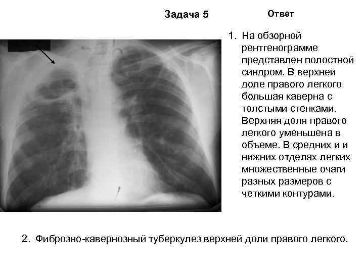Задача 5 Ответ 1. На обзорной рентгенограмме представлен полостной синдром. В верхней доле правого легкого большая каверна с толстыми стенками. Верхняя доля правого легкого уменьшена в объеме. В средних и и нижних отделах легких множественные очаги разных размеров с четкими контурами. 2. Фиброзно-кавернозный туберкулез верхней доли правого легкого.