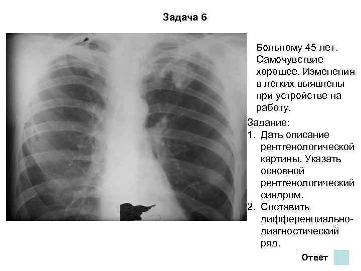 Задача 6 Больному 45 лет. Самочувствие хорошее. Изменения в легких выявлены при устройстве на работу. Задание: 1. Дать описание рентгенологической картины. Указать основной рентгенологический синдром. 2. Составить дифференциально- диагностический ряд. Ответ