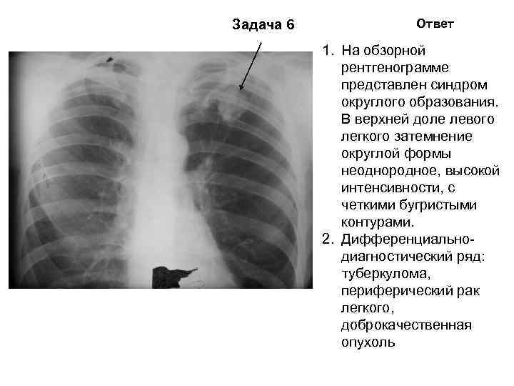Задача 6 Ответ 1. На обзорной рентгенограмме представлен синдром округлого образования. В верхней доле левого легкого затемнение округлой формы неоднородное, высокой интенсивности, с четкими бугристыми контурами. 2. Дифференциально- диагностический ряд: туберкулома, периферический рак легкого, доброкачественная опухоль