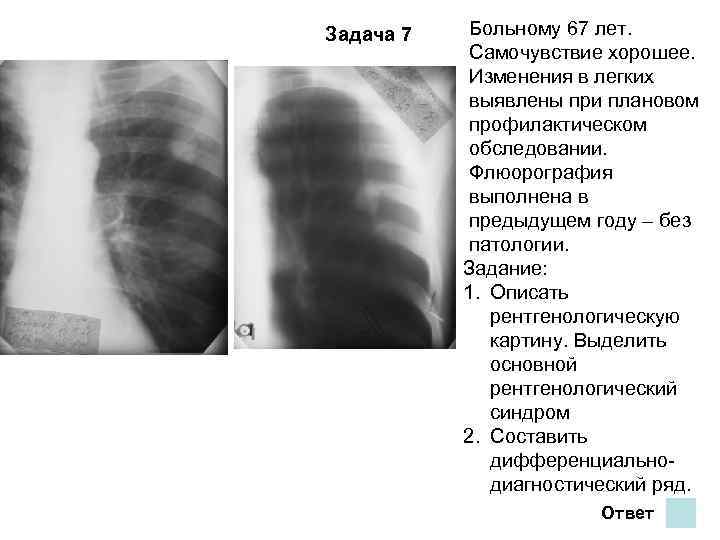 Задача 7 Больному 67 лет. Самочувствие хорошее. Изменения в легких выявлены при плановом профилактическом обследовании. Флюорография выполнена в предыдущем году – без патологии. Задание: 1. Описать рентгенологическую картину. Выделить основной рентгенологический синдром 2. Составить дифференциально- диагностический ряд. Ответ