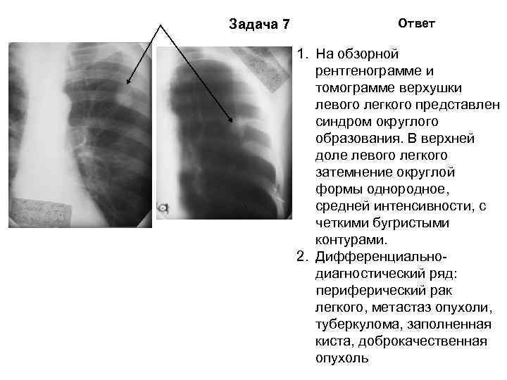 Задача 7 Ответ 1. На обзорной рентгенограмме и томограмме верхушки левого легкого представлен синдром округлого образования. В верхней доле левого легкого затемнение округлой формы однородное, средней интенсивности, с четкими бугристыми контурами. 2. Дифференциально- диагностический ряд: периферический рак легкого, метастаз опухоли, туберкулома, заполненная киста, доброкачественная опухоль