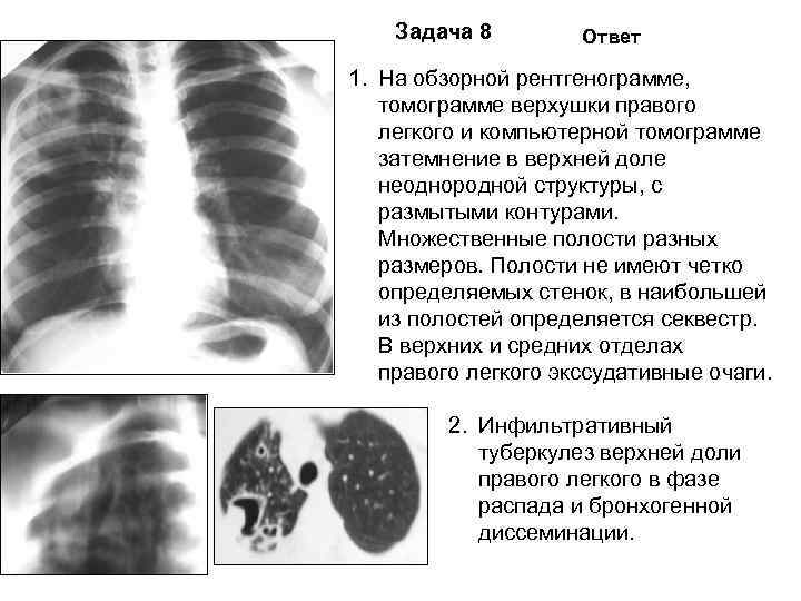 Задача 8 Ответ 1. На обзорной рентгенограмме, томограмме верхушки правого легкого и компьютерной томограмме затемнение в верхней доле неоднородной структуры, с размытыми контурами. Множественные полости разных размеров. Полости не имеют четко определяемых стенок, в наибольшей из полостей определяется секвестр. В верхних и средних отделах правого легкого экссудативные очаги. 2. Инфильтративный туберкулез верхней доли правого легкого в фазе распада и бронхогенной диссеминации.
