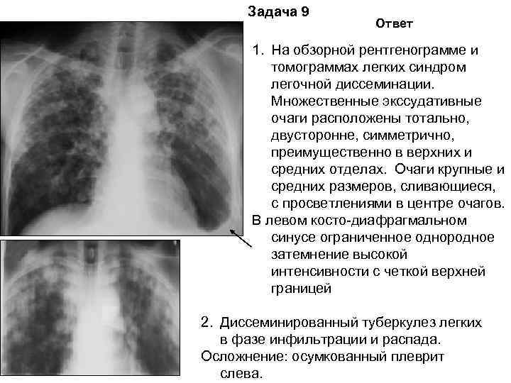Задача 9 Ответ 1. На обзорной рентгенограмме и томограммах легких синдром легочной диссеминации. Множественные экссудативные очаги расположены тотально, двусторонне, симметрично, преимущественно в верхних и средних отделах. Очаги крупные и средних размеров, сливающиеся, с просветлениями в центре очагов. В левом косто-диафрагмальном синусе ограниченное однородное затемнение высокой интенсивности с четкой верхней границей 2. Диссеминированный туберкулез легких в фазе инфильтрации и распада. Осложнение: осумкованный плеврит слева.
