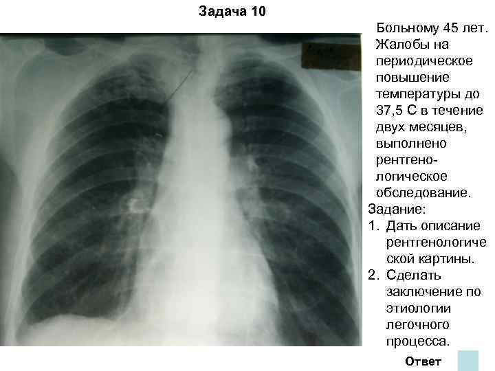 Задача 10 Больному 45 лет. Жалобы на периодическое повышение температуры до 37, 5 С в течение двух месяцев, выполнено рентгено- логическое обследование. Задание: 1. Дать описание рентгенологиче ской картины. 2. Сделать заключение по этиологии легочного процесса. Ответ