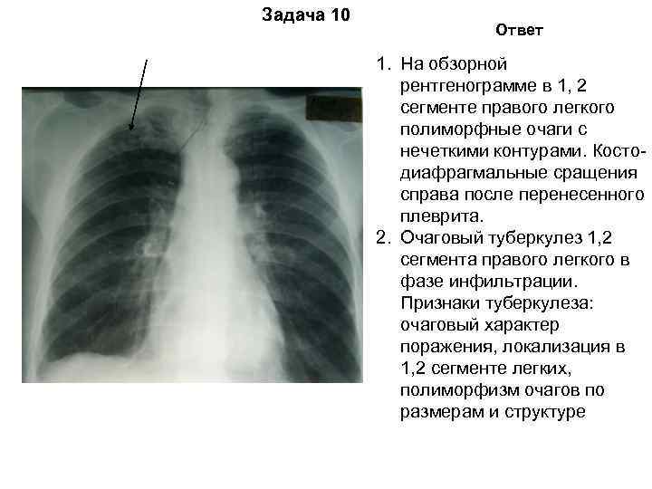 Задача 10 Ответ 1. На обзорной рентгенограмме в 1, 2 сегменте правого легкого полиморфные очаги с нечеткими контурами. Косто- диафрагмальные сращения справа после перенесенного плеврита. 2. Очаговый туберкулез 1, 2 сегмента правого легкого в фазе инфильтрации. Признаки туберкулеза: очаговый характер поражения, локализация в 1, 2 сегменте легких, полиморфизм очагов по размерам и структуре