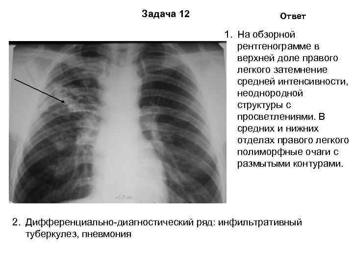 Задача 12 Ответ 1. На обзорной рентгенограмме в верхней доле правого легкого затемнение средней интенсивности, неоднородной структуры с просветлениями. В средних и нижних отделах правого легкого полиморфные очаги с размытыми контурами. 2. Дифференциально-диагностический ряд: инфильтративный туберкулез, пневмония