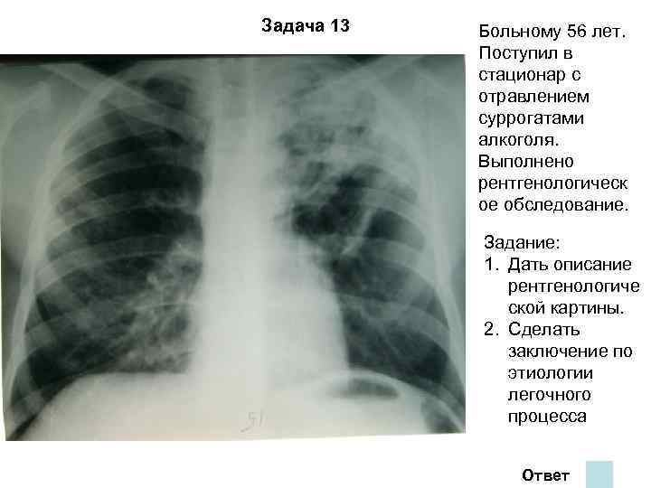 Задача 13 Больному 56 лет. Поступил в стационар с отравлением суррогатами алкоголя. Выполнено рентгенологическ ое обследование. Задание: 1. Дать описание рентгенологиче ской картины. 2. Сделать заключение по этиологии легочного процесса Ответ