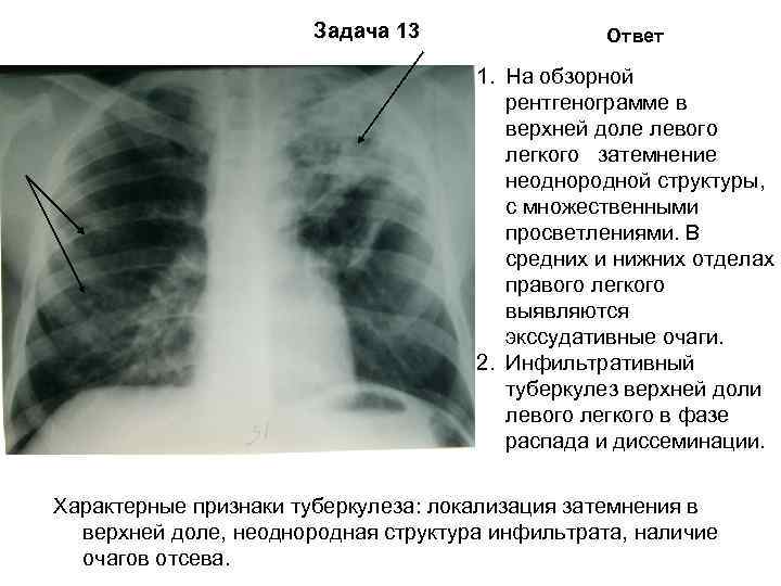 Задача 13 Ответ 1. На обзорной рентгенограмме в верхней доле левого легкого затемнение неоднородной структуры, с множественными просветлениями. В средних и нижних отделах правого легкого выявляются экссудативные очаги. 2. Инфильтративный туберкулез верхней доли левого легкого в фазе распада и диссеминации. Характерные признаки туберкулеза: локализация затемнения в верхней доле, неоднородная структура инфильтрата, наличие очагов отсева.
