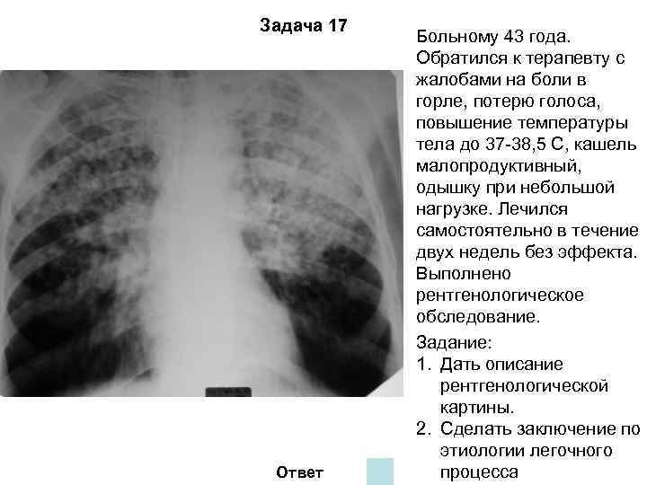 Задача 17 Больному 43 года. Обратился к терапевту с жалобами на боли в горле, потерю голоса, повышение температуры тела до 37 -38, 5 С, кашель малопродуктивный, одышку при небольшой нагрузке. Лечился самостоятельно в течение двух недель без эффекта. Выполнено рентгенологическое обследование. Задание: 1. Дать описание рентгенологической картины. 2. Сделать заключение по этиологии легочного Ответ процесса