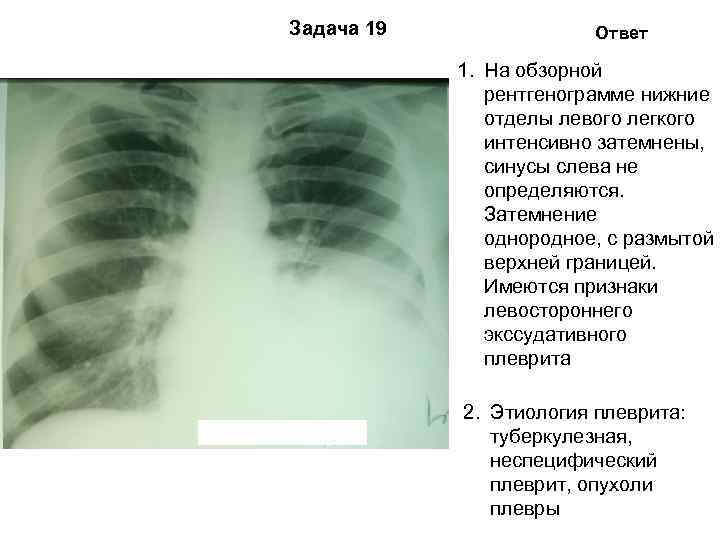 Задача 19 Ответ 1. На обзорной рентгенограмме нижние отделы левого легкого интенсивно затемнены, синусы слева не определяются. Затемнение однородное, с размытой верхней границей. Имеются признаки левостороннего экссудативного плеврита 2. Этиология плеврита: туберкулезная, неспецифический плеврит, опухоли плевры