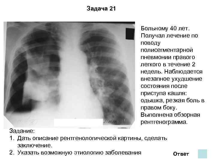 Задача 21 Больному 40 лет. Получал лечение по поводу полисегментарной пневмонии правого легкого в течение 2 недель. Наблюдается внезапное ухудшение состояния после приступа кашля: одышка, резкая боль в правом боку. Выполнена обзорная рентгенограмма. Задание: 1. Дать описание рентгенологической картины, сделать заключение. 2. Указать возможную этиологию заболевания Ответ
