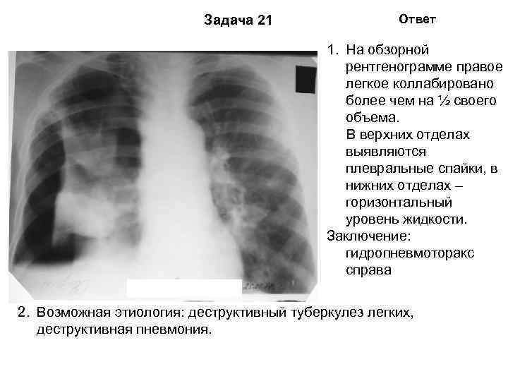 Задача 21 Ответ 1. На обзорной рентгенограмме правое легкое коллабировано более чем на ½ своего объема. В верхних отделах выявляются плевральные спайки, в нижних отделах – горизонтальный уровень жидкости. Заключение: гидропневмоторакс справа 2. Возможная этиология: деструктивный туберкулез легких, деструктивная пневмония.
