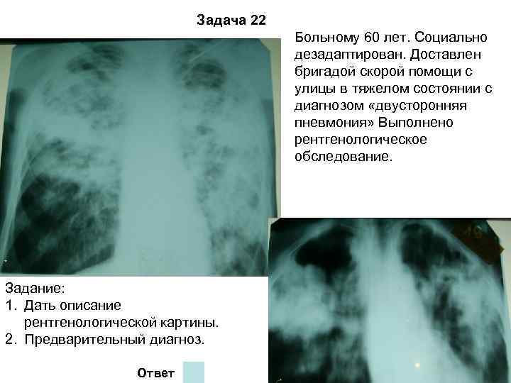Задача 22 Больному 60 лет. Социально дезадаптирован. Доставлен бригадой скорой помощи с улицы в тяжелом состоянии с диагнозом «двусторонняя пневмония» Выполнено рентгенологическое обследование. Задание: 1. Дать описание рентгенологической картины. 2. Предварительный диагноз. Ответ