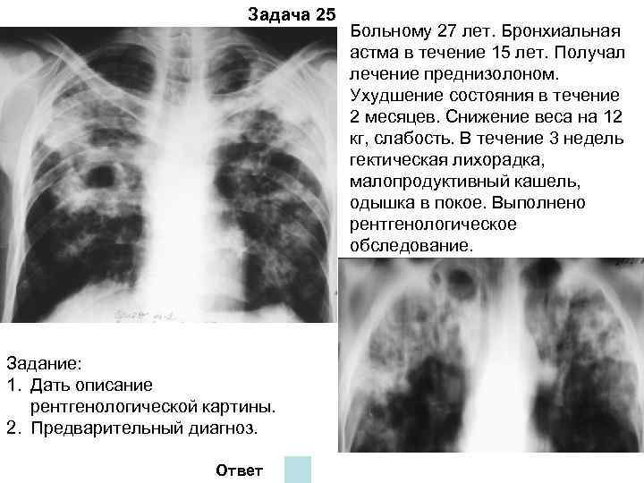 Задача 25 Больному 27 лет. Бронхиальная астма в течение 15 лет. Получал лечение преднизолоном. Ухудшение состояния в течение 2 месяцев. Снижение веса на 12 кг, слабость. В течение 3 недель гектическая лихорадка, малопродуктивный кашель, одышка в покое. Выполнено рентгенологическое обследование. Задание: 1. Дать описание рентгенологической картины. 2. Предварительный диагноз. Ответ