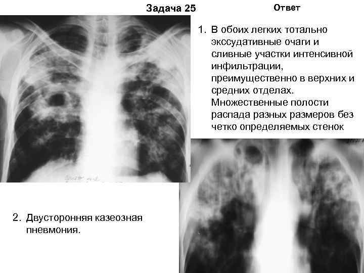Задача 25 Ответ 1. В обоих легких тотально экссудативные очаги и сливные участки интенсивной инфильтрации, преимущественно в верхних и средних отделах. Множественные полости распада разных размеров без четко определяемых стенок 2. Двусторонняя казеозная пневмония.