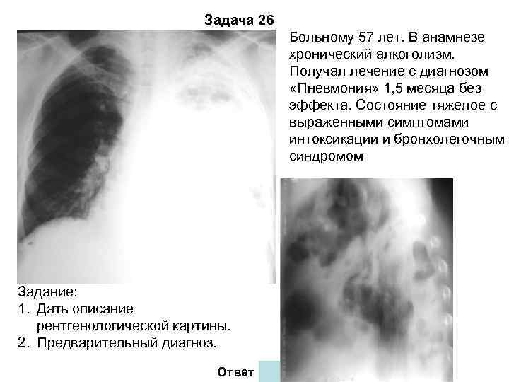 Задача 26 Больному 57 лет. В анамнезе хронический алкоголизм. Получал лечение с диагнозом «Пневмония» 1, 5 месяца без эффекта. Состояние тяжелое с выраженными симптомами интоксикации и бронхолегочным синдромом Задание: 1. Дать описание рентгенологической картины. 2. Предварительный диагноз. Ответ