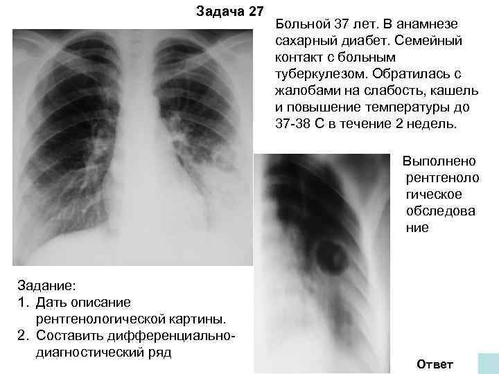 Задача 27 Больной 37 лет. В анамнезе сахарный диабет. Семейный контакт с больным туберкулезом. Обратилась с жалобами на слабость, кашель и повышение температуры до 37 -38 С в течение 2 недель. Выполнено рентгеноло гическое обследова ние Задание: 1. Дать описание рентгенологической картины. 2. Составить дифференциально- диагностический ряд Ответ