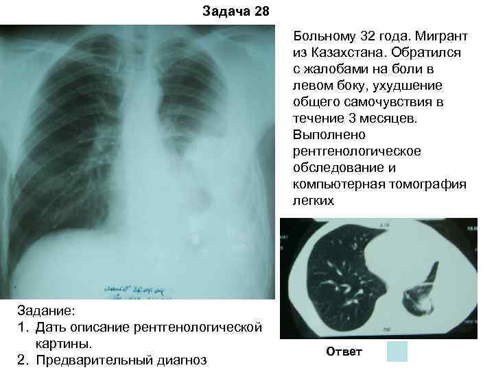Задача 28 Больному 32 года. Мигрант из Казахстана. Обратился с жалобами на боли в левом боку, ухудшение общего самочувствия в течение 3 месяцев. Выполнено рентгенологическое обследование и компьютерная томография легких Задание: 1. Дать описание рентгенологической картины. Ответ 2. Предварительный диагноз