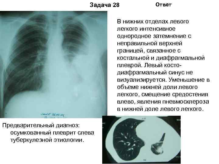 Задача 28 Ответ В нижних отделах левого легкого интенсивное однородное затемнение с неправильной верхней границей, связанное с костальной и диафрагмальной плеврой. Левый косто- диафрагмальный синус не визуализируется. Уменьшение в объеме нижней доли левого легкого, смещение средостения влево, явления пневмосклероза в нижней доле левого легкого. Предварительный диагноз: осумкованный плеврит слева туберкулезной этиологии.