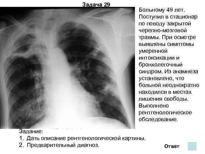 Задача 29 Больному 49 лет. Поступил в стационар по поводу закрытой черепно-мозговой травмы. При осмотре выявлены симптомы умеренной интоксикации и бронхолегочный синдром. Из анамнеза установлено, что больной неоднократно находился в местах лишения свободы. Выполнено рентгенологическое обследование. Задание: 1. Дать описание рентгенологической картины. 2. Предварительный диагноз. Ответ
