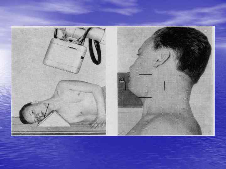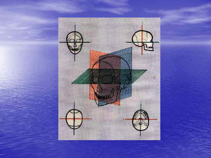 • При обзорной рентгенографии черепа голову • • укладывают таким образом, чтобы одна плоскость была параллельна плоскости кассеты, другие плоскости перпендикулярны. При рентгенографии в дополнительных обзорных проекциях перпендикулярно к плоскости стола расположена только сагиттальная, другие 2 плоскости проходят под разными углами (носолобная, подбородочная). При выполнении снимков в полуаксиальных проекциях плоскость физиологической горизонтали и ушной вертикали ориентируют к кассете под углом 45 о. Специальные снимки черепа так же выполняются с учетом ориентации основных плоскостей головы под различными углами к плоскости кассеты.