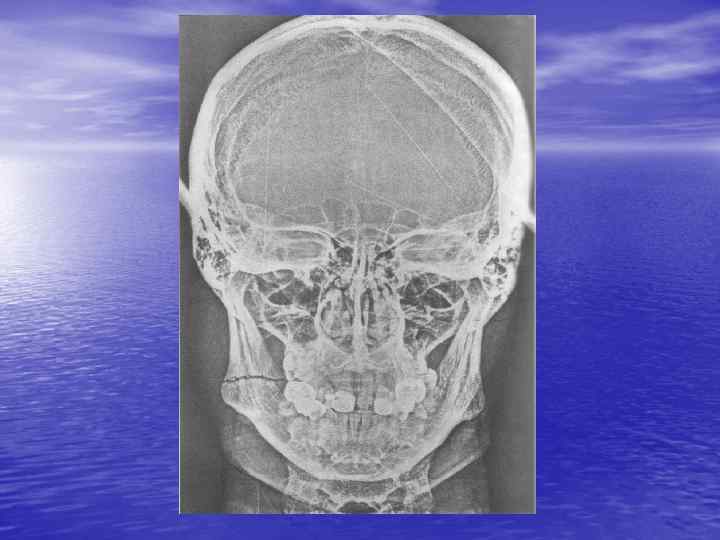 • Контактные снимки – область поражения выводят в центральную зону, а расстояние фокус трубки – касета уменьшают до 60 -80 см или практически вплотную. Получается изолированное четкое изображение снимаемой зоны. • При выполнении касательных снимков пораженную область выводят в краеобразующее положение, чтобы исследуемый участок выступал над центром кассеты. Пучок излучения направляют касательно к изучаемому участку устанавливают индикатор. Фокусное расстояние 60 -80 см. • Требования к рентгенографии черепа: - строгая симметричность укладки - исключить динамическую нерезкость - структурность – видимость костной структуры