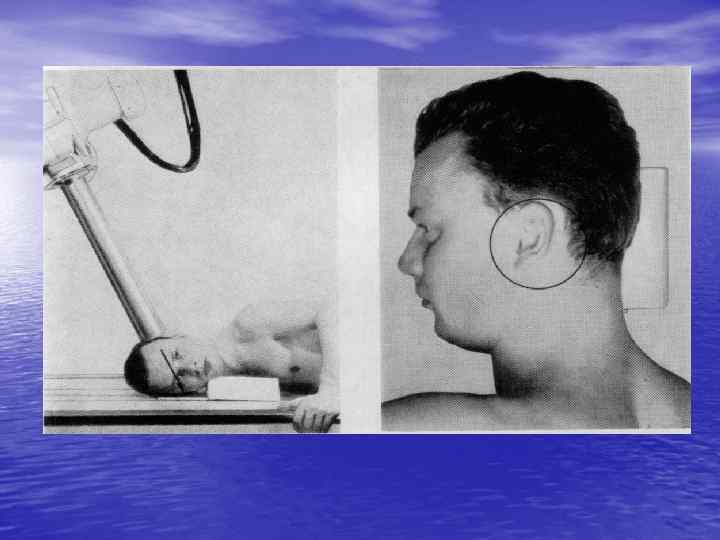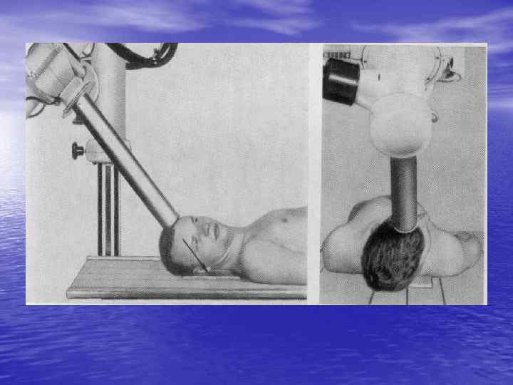Рентгеновскую трубку наклоняют в каудальном направлении и пучок рентгеновского излучения центрируют под углом 45 о к плоскости стола на большое затылочное отверстие.