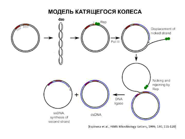 МОДЕЛЬ КАТЯЩЕГОСЯ КОЛЕСА DSO: - сайт связывания с Rep, сиквенс-специфичен; - сайт разрезания, консервативен; - терминаторный энхансер, имеет четкую позицию относительно 2 -го локуса. [Espinosa et al. , FEMS Microbiology Letters, 1995, 130, 111 -120]
