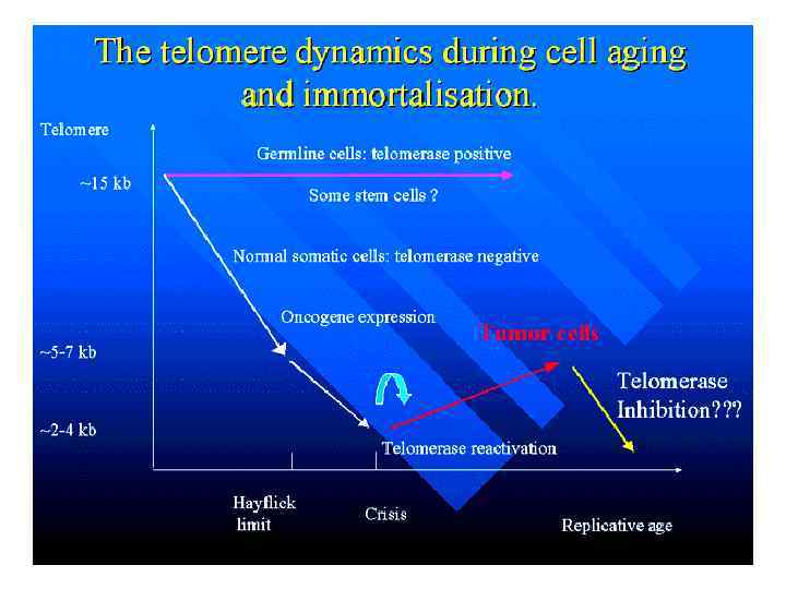 ТЕЛОМЕРЫ Теломе ры (от др. -греч. τέλος — конец и μέρος — часть) — концевые участки хромосом Исследование длины теломерных повторов лейкоцитов переферической крови, клеток эпидермиса и сперматозоидов человека (различный возраст доноров) Donor age: 10 14 38 24 31 46 58 93 Southern blot (TTAGGG)n зонд экстракция ДНК с последующей обработкой рестриктазами сокращение теломер - это молекулярные или «митотические" часы, которые лежат в основе старения [Allsopp RC et al. , Telomere length predicts replicative capacity of human fibroblasts. PNAS. 1992, 89(21), 10114 -8]