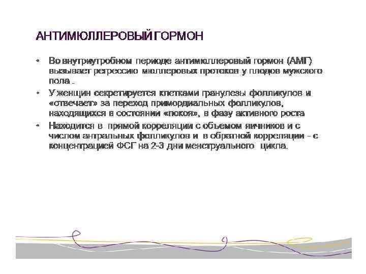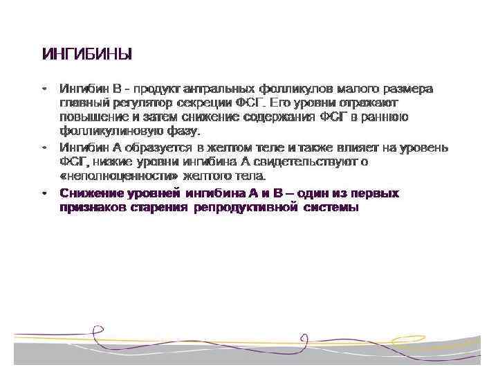Ингибины и АМГ • Cуперсемейство трансформирующего фактора роста TGF-β включает гормоны ингибины, активины, а также антимюллеров гормон. • Димерные гликопротеины, вовлеченные в регуляцию роста и дифференцировки тканей • Ингибин В и AMH синтезируются клетками Сертоли у мужчин и гранулезными клетками у женщин • Ингибин селективно угнетает секрецию фолликулостиму-лирующего гормона (ФСГ) гипофиза у мужчин и у женщин, уменьшает количество рецепторов Gn. RH в гипофизе