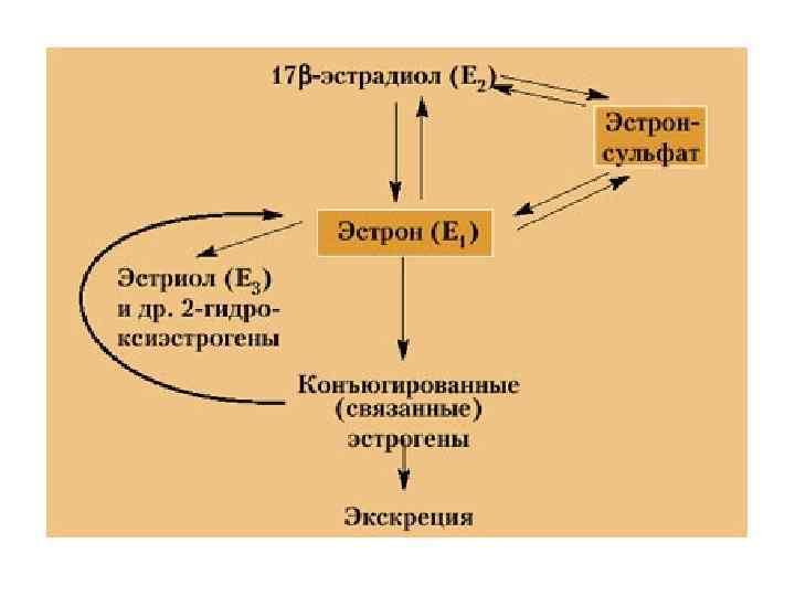 ЭСТРОГЕНЫ – С 18 -стероиды с ароматическим кольцом и ОН-группой у С 3 -атома ЭСТРАДИОЛ (Е 2) Относительная активность: 100% ЭСТРОН (Е 1) 10% Фолликулы яичников, кора надпочечников, плацента (беременность), жировая ткань (Е 1) ЭСТРИОЛ (Е 3) 2 -4% Метаболическая деградация Е 1 и Е 2, плацента (беременность) Продукты обмена эстрогенов экскретируются в виде эфиров с серной и глюкуроновой кислотами, синтезируемыми в печени, и выделяются с мочой в связанной белками плазмы форме