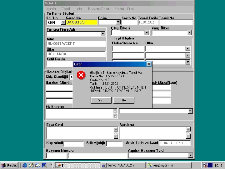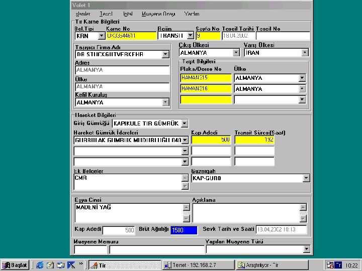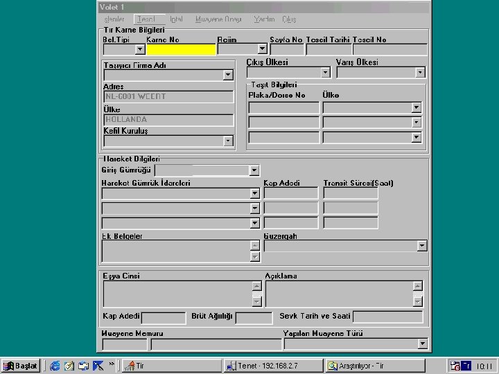 NEW AUTOMATED TIR SYSTEM Incoming Office Outgoing/Destination Office Real time data entry. Inspector is assigned automaticly by the system Information is disseminated to related offices via network Information Headquarter