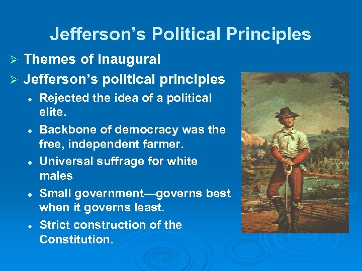 Jefferson’s Political Principles Themes of inaugural Ø Jefferson’s political principles Ø l l l Rejected the idea of a political elite. Backbone of democracy was the free, independent farmer. Universal suffrage for white males Small government—governs best when it governs least. Strict construction of the Constitution.