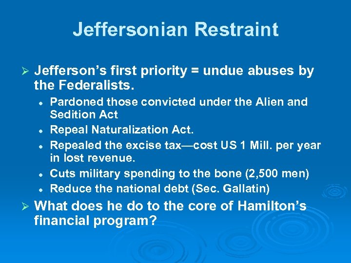 Jeffersonian Restraint Ø Jefferson’s first priority = undue abuses by the Federalists. l l l Ø Pardoned those convicted under the Alien and Sedition Act Repeal Naturalization Act. Repealed the excise tax—cost US 1 Mill. per year in lost revenue. Cuts military spending to the bone (2, 500 men) Reduce the national debt (Sec. Gallatin) What does he do to the core of Hamilton’s financial program?