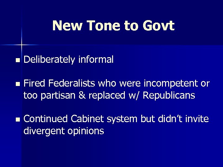 New Tone to Govt n Deliberately informal n Fired Federalists who were incompetent or too partisan & replaced w/ Republicans n Continued Cabinet system but didn’t invite divergent opinions