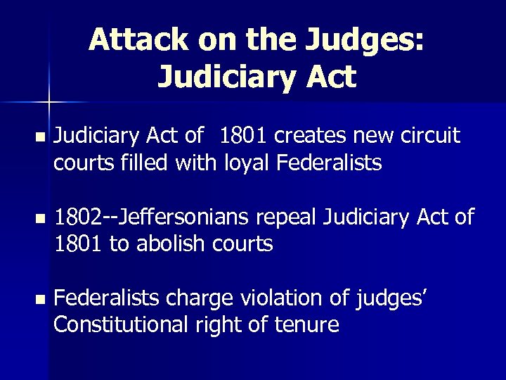 Attack on the Judges: Judiciary Act n Judiciary Act of 1801 creates new circuit courts filled with loyal Federalists n 1802 --Jeffersonians repeal Judiciary Act of 1801 to abolish courts n Federalists charge violation of judges’ Constitutional right of tenure