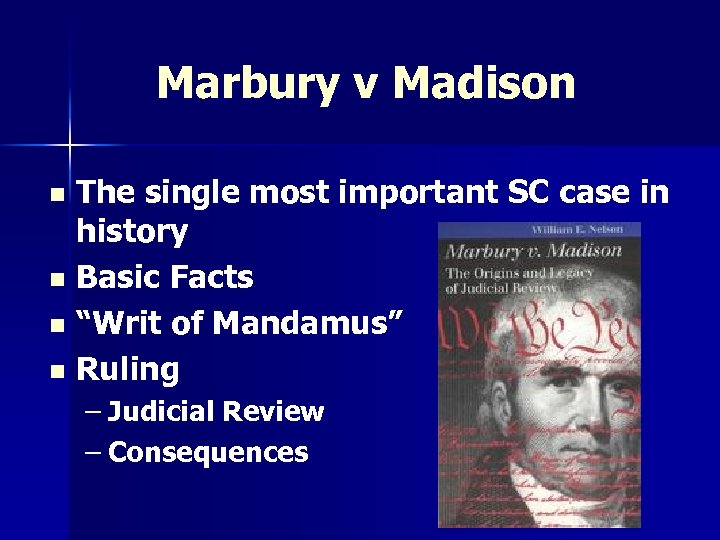 Marbury v Madison The single most important SC case in history n Basic Facts n “Writ of Mandamus” n Ruling n – Judicial Review – Consequences