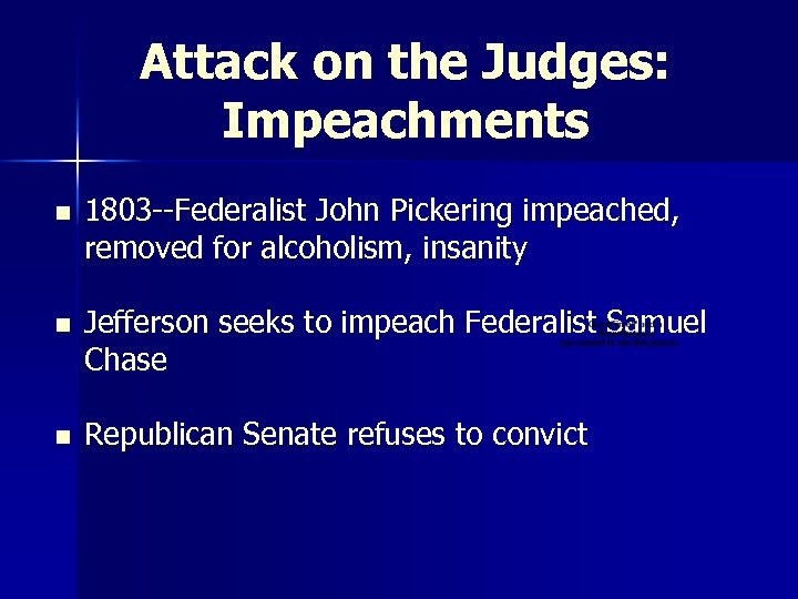 Attack on the Judges: Impeachments n 1803 --Federalist John Pickering impeached, removed for alcoholism, insanity n Jefferson seeks to impeach Federalist Samuel Chase n Republican Senate refuses to convict