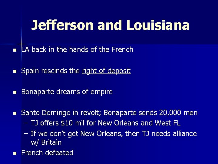 Jefferson and Louisiana n LA back in the hands of the French n Spain rescinds the right of deposit n Bonaparte dreams of empire n Santo Domingo in revolt; Bonaparte sends 20, 000 men – TJ offers $10 mil for New Orleans and West FL – If we don’t get New Orleans, then TJ needs alliance w/ Britain French defeated n