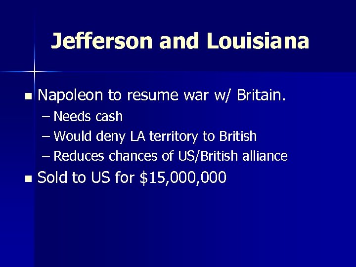 Jefferson and Louisiana n Napoleon to resume war w/ Britain. – Needs cash – Would deny LA territory to British – Reduces chances of US/British alliance n Sold to US for $15, 000
