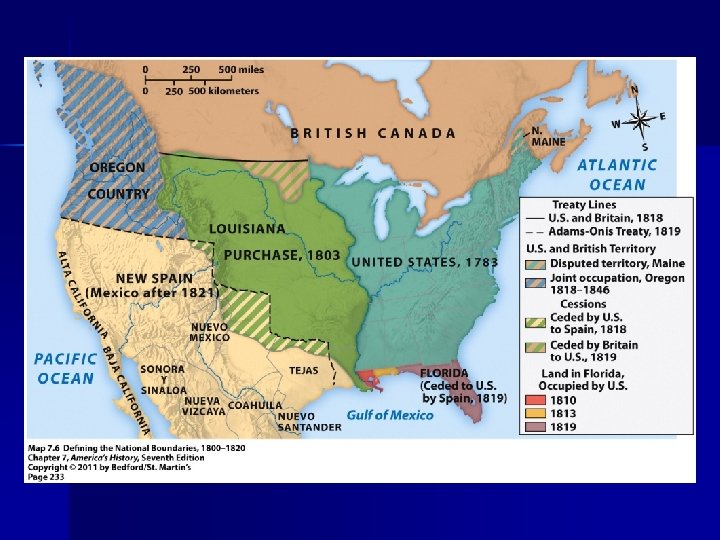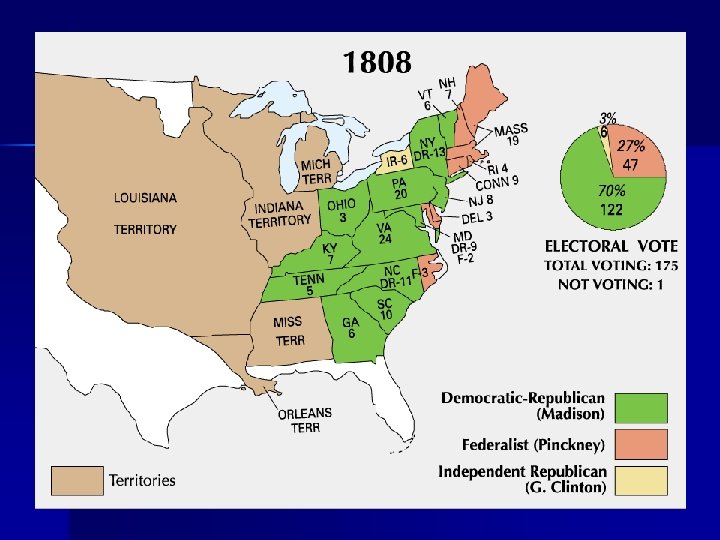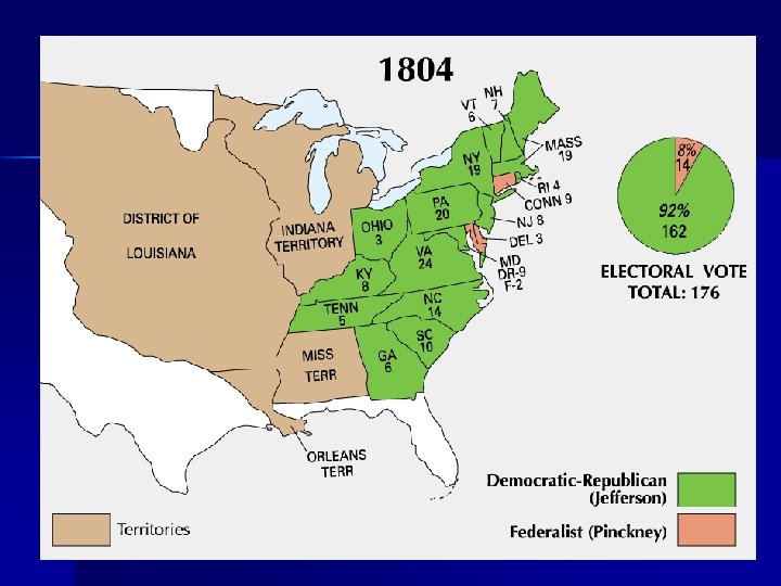 The Louisiana Purchase Constitution doesn’t grant power to President to add new territory – He suggests an amendment – BUT delay make Napoleon change mind n n Federalists all of a sudden become strict constructionists – Real issue was the growth of Western states which could be expected to be Republican What is the precedent set here?
