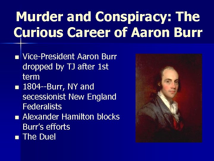 Murder and Conspiracy: The Curious Career of Aaron Burr n n Vice-President Aaron Burr dropped by TJ after 1 st term 1804 --Burr, NY and secessionist New England Federalists Alexander Hamilton blocks Burr’s efforts The Duel