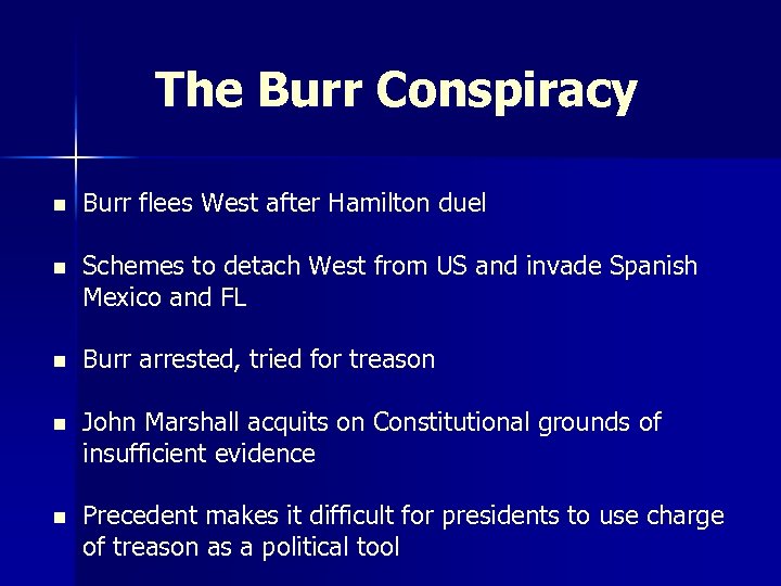The Burr Conspiracy n Burr flees West after Hamilton duel n Schemes to detach West from US and invade Spanish Mexico and FL n Burr arrested, tried for treason n John Marshall acquits on Constitutional grounds of insufficient evidence n Precedent makes it difficult for presidents to use charge of treason as a political tool